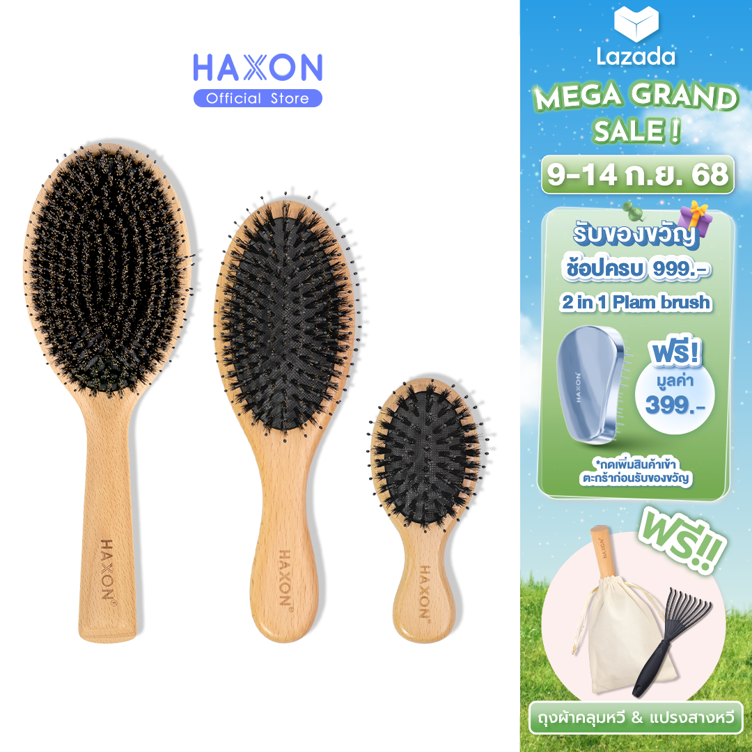 Haxon Boar-Bristle Hair Brush หวีขนหมูป่าแท้ ขนหมูอัดแน่น หวีลดผมร่วง ช่วยให้ผมเงางาม แก้ผมพันกัน ช่วยนวดศีรษะ ลดไฟฟ้าสถิต ด้ามไม้แข็งแรง